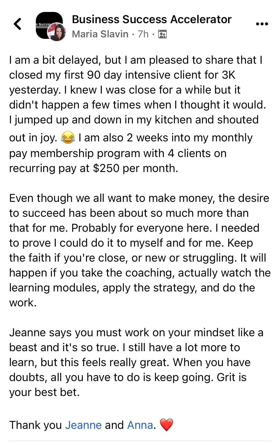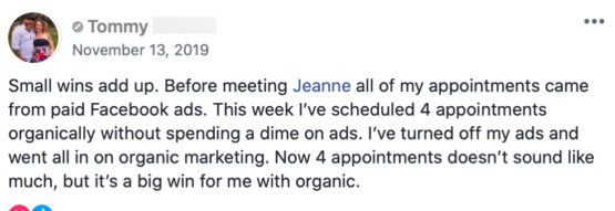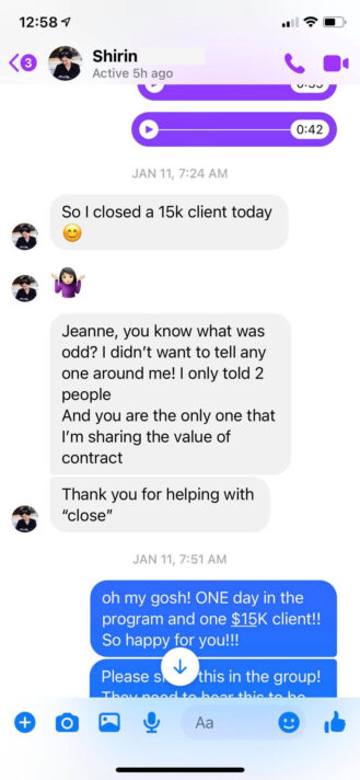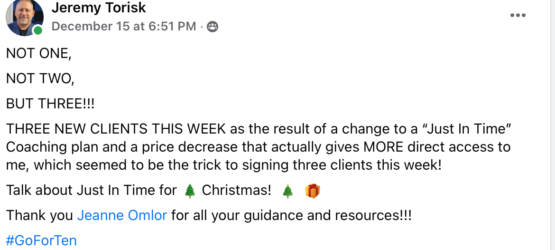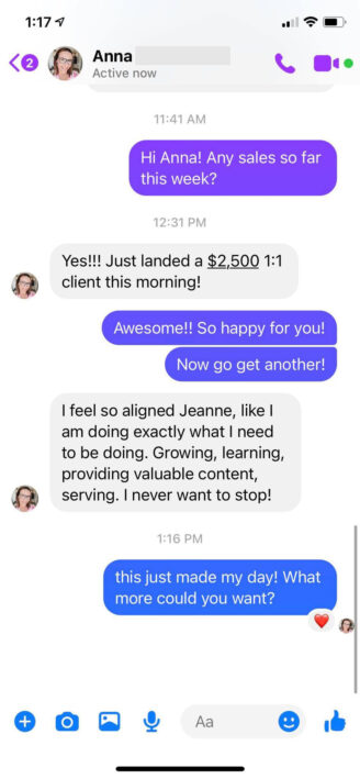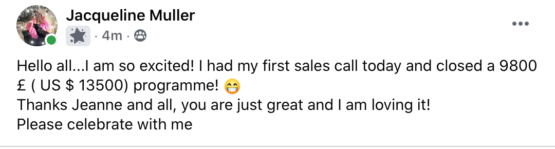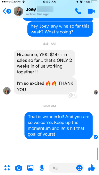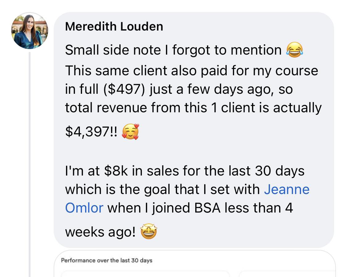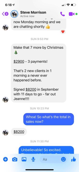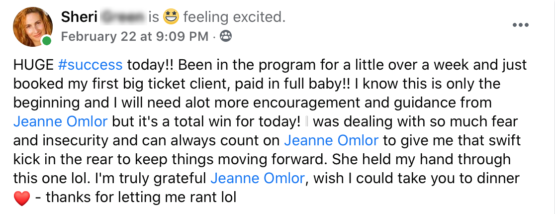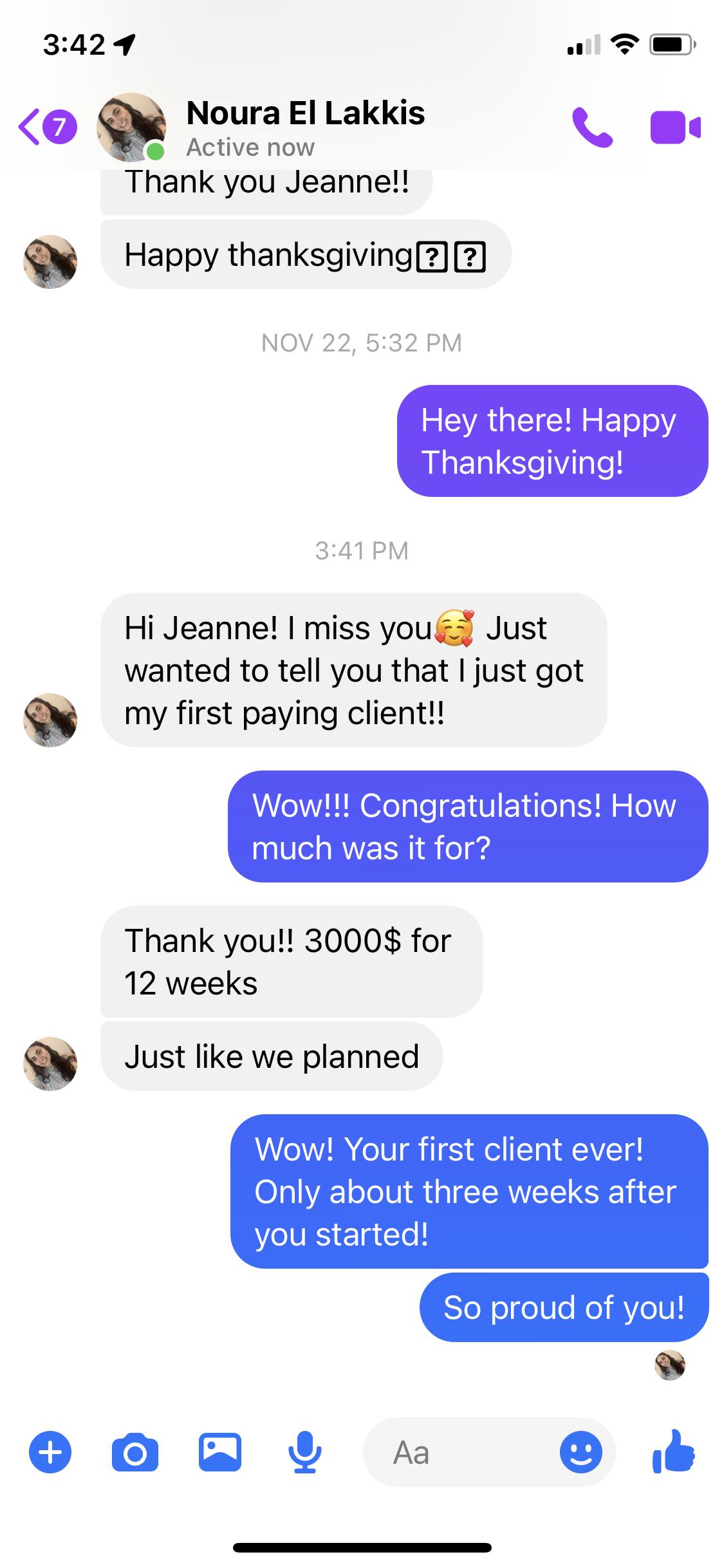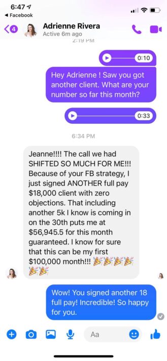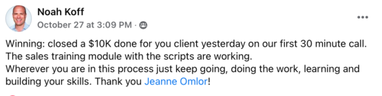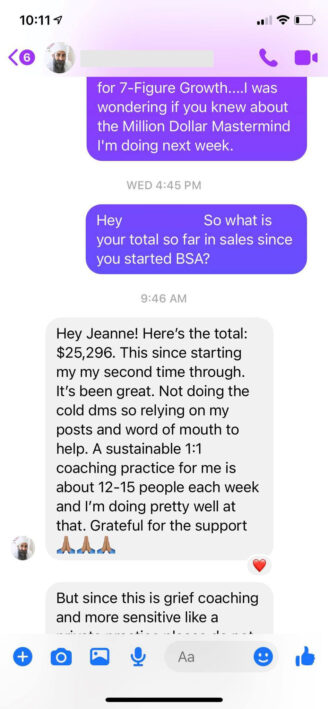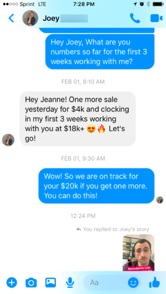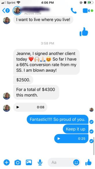 Joey came to Jeanne to learn how to consistently make 5 Figure Months in his Service Based Business and within a couple of weeks of working with Jeanne he brought in a $14,000 of Revenue. A very happy client indeed!