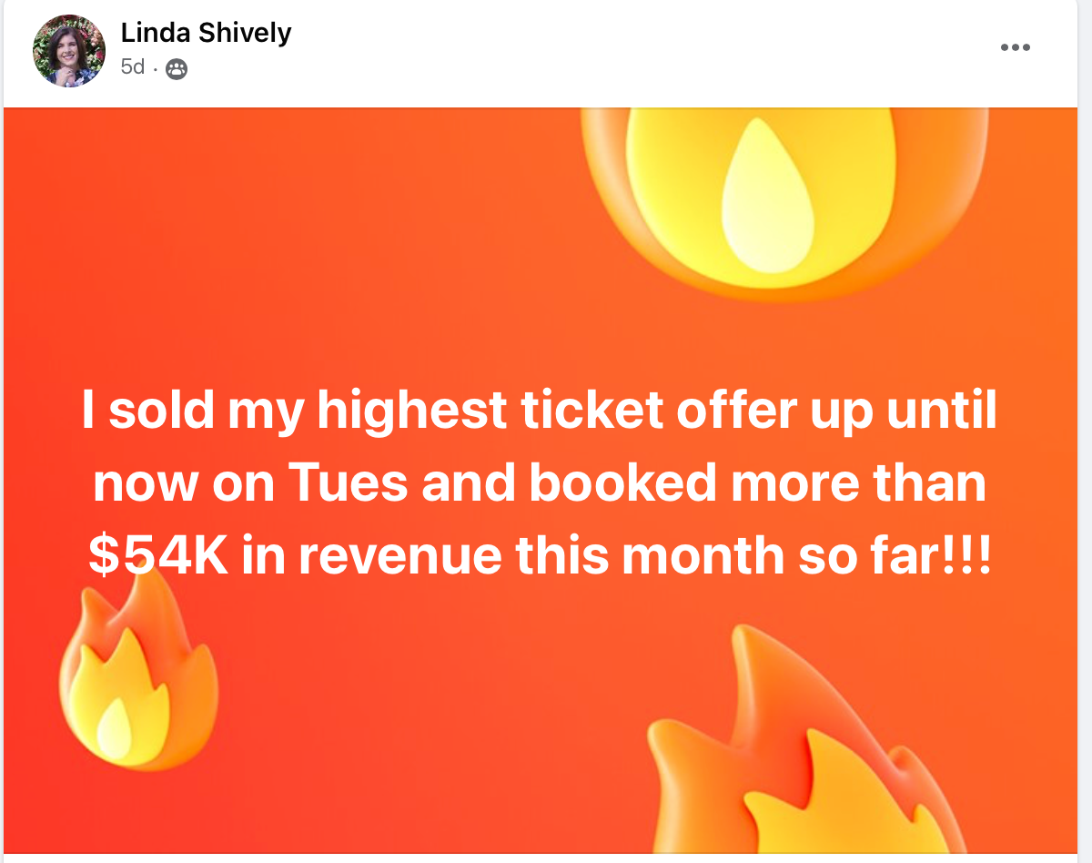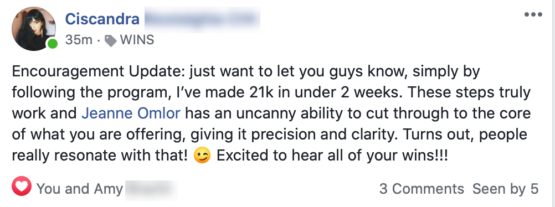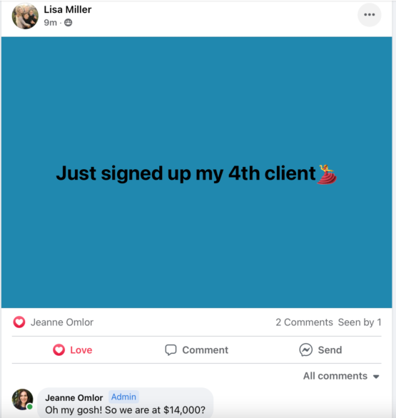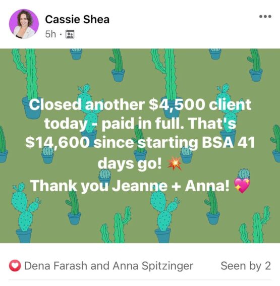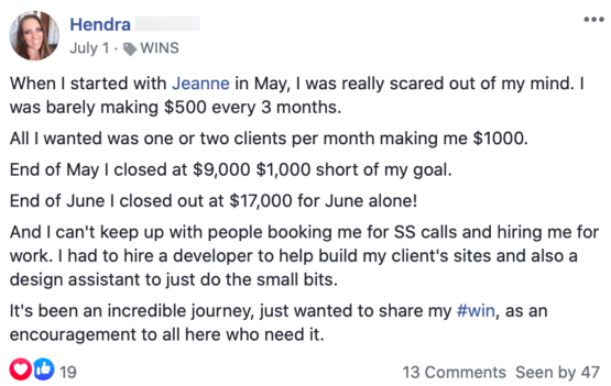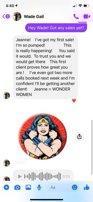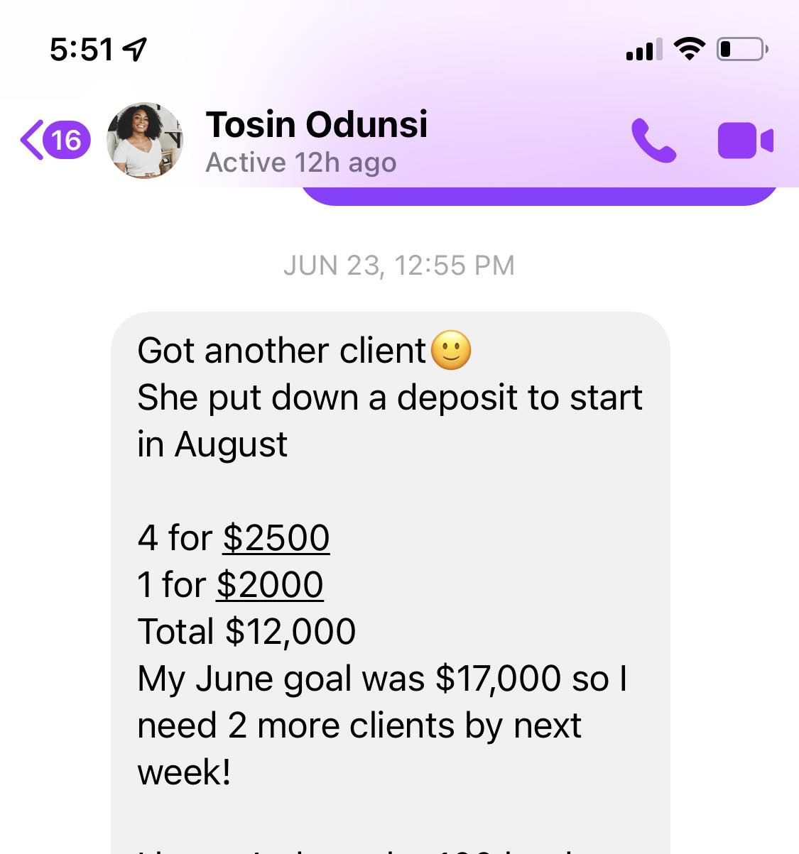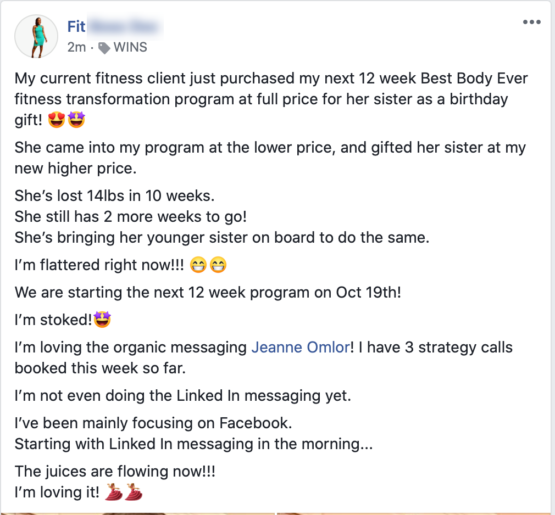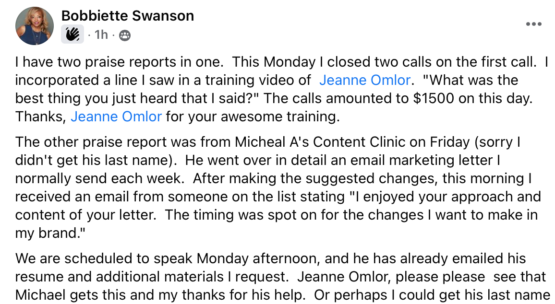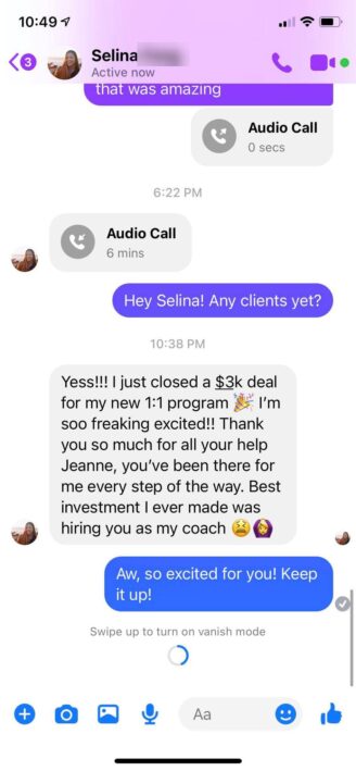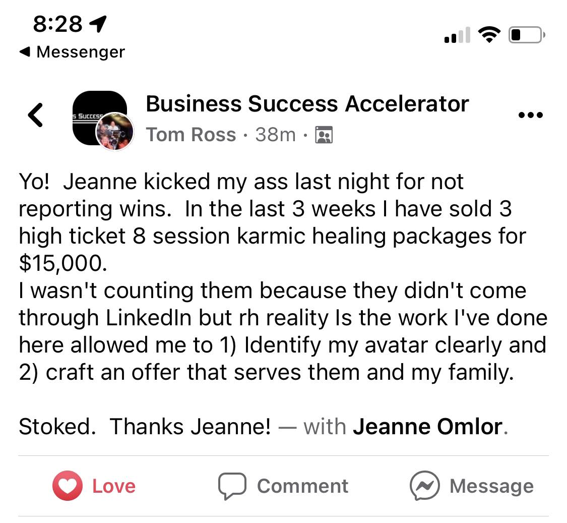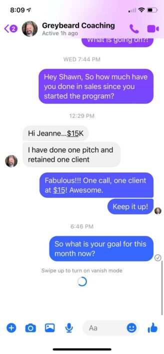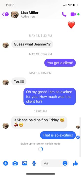 Joey came to Jeanne to learn how to consistently make 5 Figure Months in his Service Based Business and within a couple of weeks of working with Jeanne he brought in a $14,000 of Revenue. A very happy client indeed!