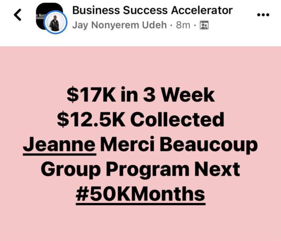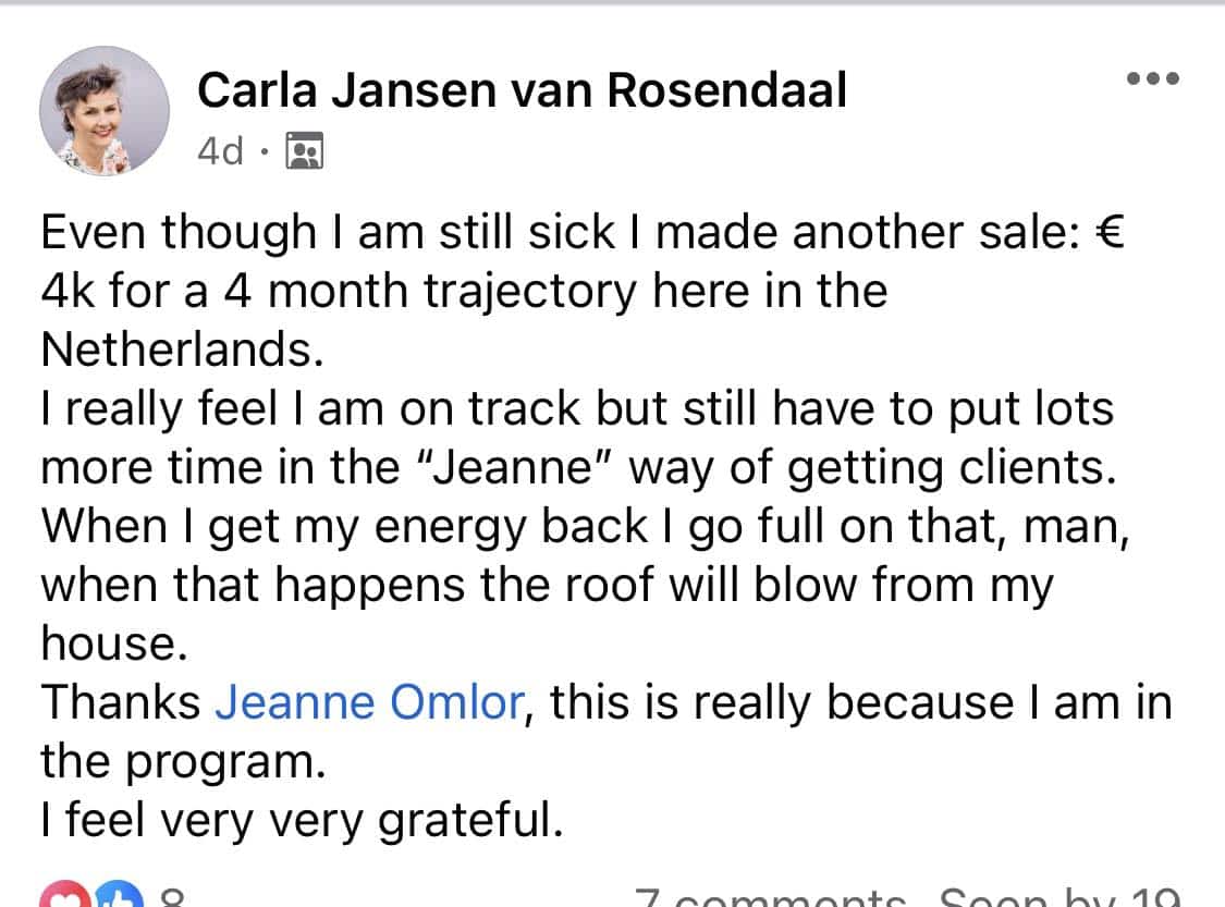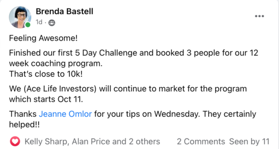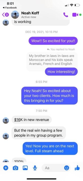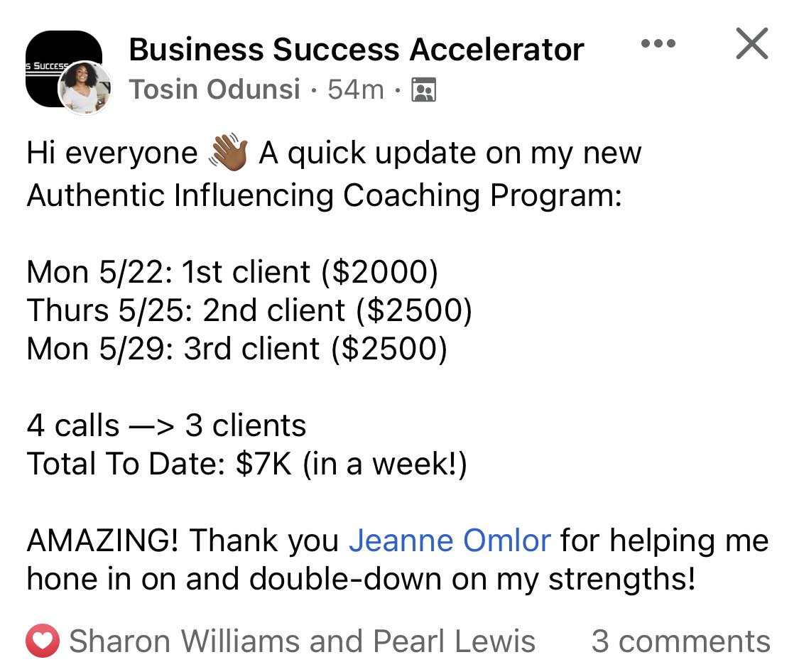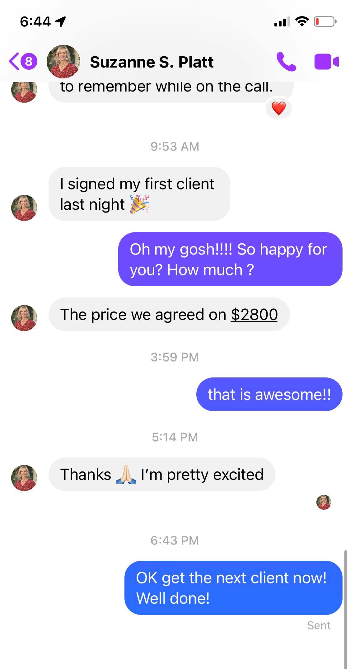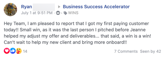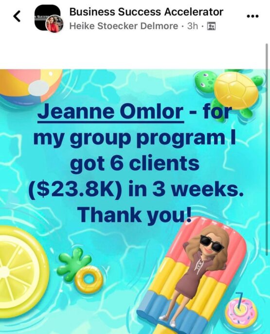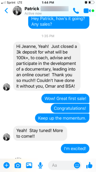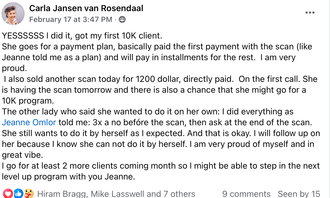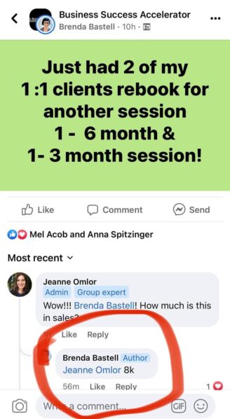 Joey came to Jeanne to learn how to consistently make 5 Figure Months in his Service Based Business and within a couple of weeks of working with Jeanne he brought in a $14,000 of Revenue. A very happy client indeed!