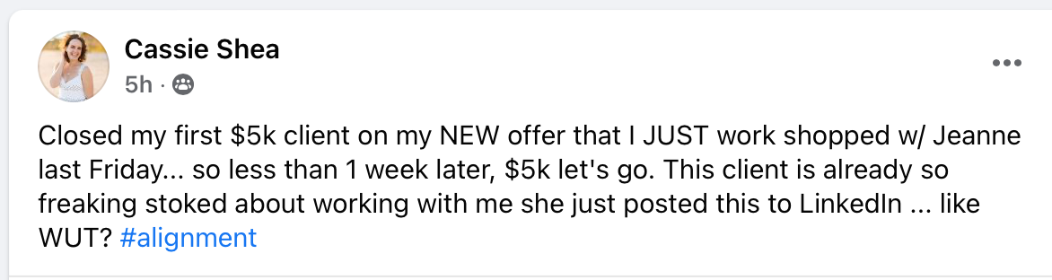 Cassie works with energy AND execution tools to help high performers scale new heights and make purposeful impact. Here’s how she got to over $11k in one week of working with us
