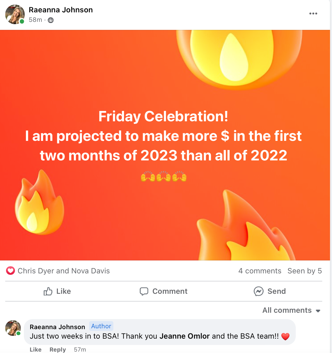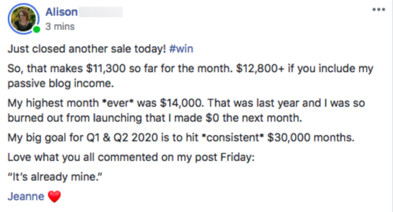 Alison was struggling with the volume of her sales calls when she reached out to Jeanne. After only one month of working with Jeanne, Alison brought in 11K before the month had even closed out. From going through the Business Success Accelerator Program, Alison loved the mindset & accountability plus the easy access to Jeanne and the Coaches.
