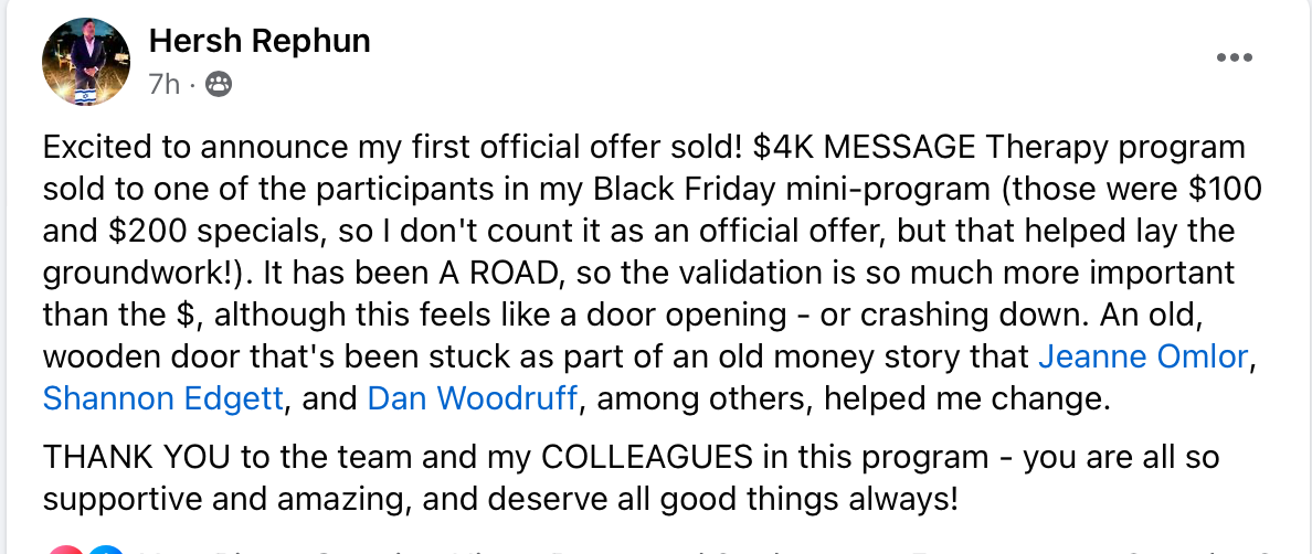 Hersh broke through old money and confidence patterns and started getting $4K full pay clients.
