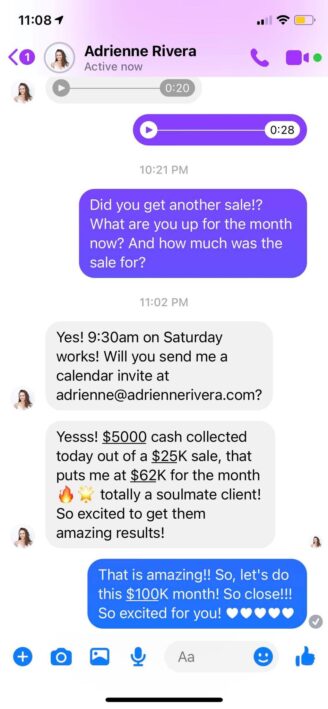 Adrienne helps coaches and healers through alignment, connection, and online events. In one week and a half she has brought in over $56K into her business and then she got $88K in three weeks of working with us!